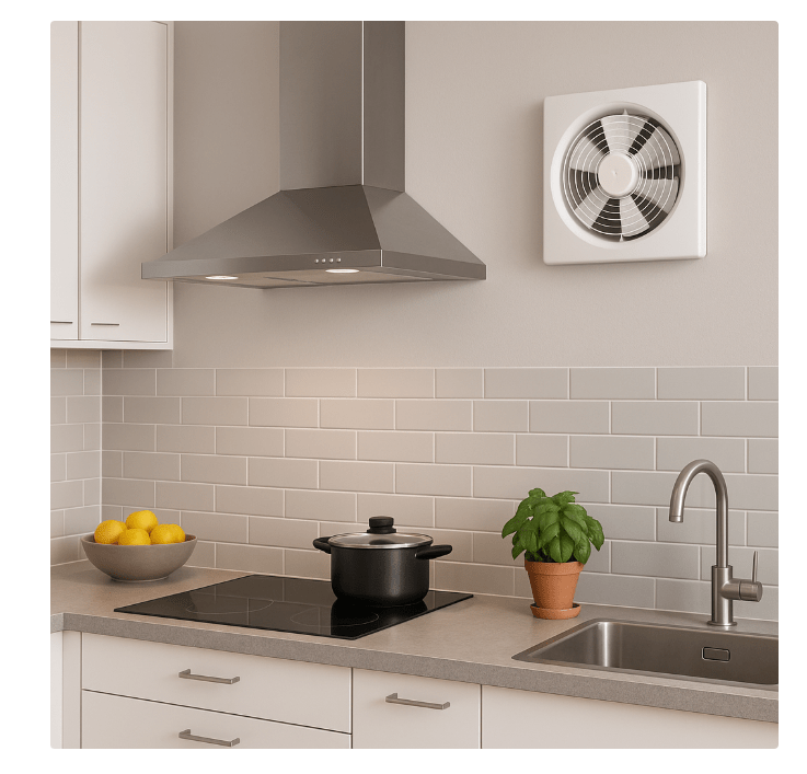 מערכות אוורור חכמות מנטרות לחות וטמפרטורה ומפעילות את האוורור רק כשצריך – פתרון מושלם למטבחים גדולים או פתוחים.